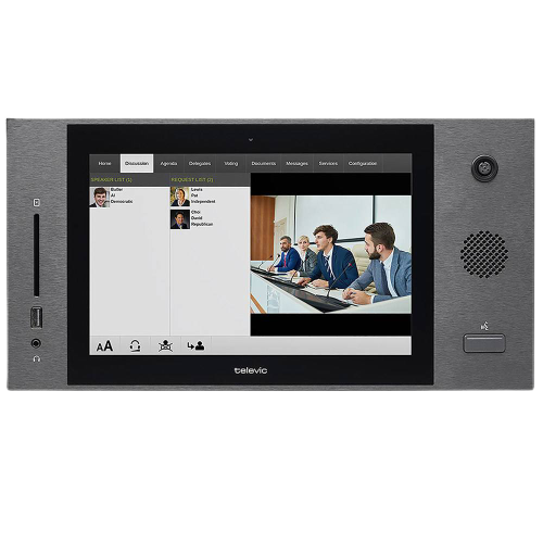 Wired, Flushmount, Voting, 64 ch Interpreter system, 30-70 Conference Mic, 10″ Touch Screen Display, USB Port (5V),Internal Camera