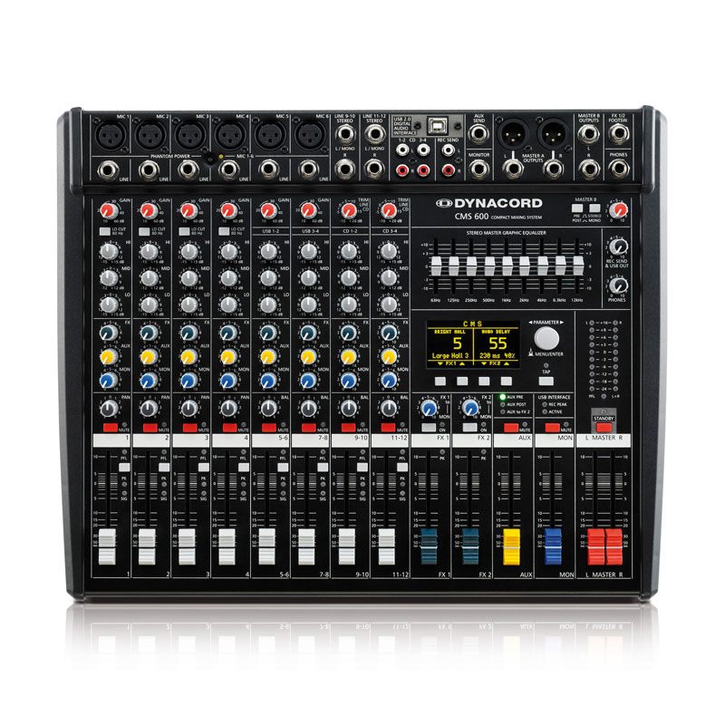 میکسر آنالوگ CMS 600-3 یک میکسر صدا کوچک 8 کاناله ساخت کمپانی دایناکورد آلمان است. از این تعداد ورودی، 6 کانال جهت اتصال میکروفون و دو کانال جهت ورود سیگنال های استریو طراحی شده است. تمامی پتانسیوتر ها و فیدر های استفاده شده درCMS600 از برند ALPS هستند تا علاوه بر عبور بدون افت کیفیت سیگنال از آنها، سالیان دراز به مصرف کننده ی خود بدون افت کیفیت سرویس دهی کند. در بخش نوار های ورودی این میکسر آنالوگ روی هر نوار امکانات تغییر گین ورودی، اکولایزر سه باندی، فیلتر حذف فرکانس های پایین، FX send، Aux Send و Monitor Send فراهم شده است. همچنین جهت اتصال بی درد سر ورودی های متفاوت میکروفون، لاین مونو و لاین استریو از دستگاه های متفاوت، ورودی های مختلف XLR ،TRS و RCA روی میکسر CMS 600-3 تعبیه شده است. میزان دیستورشن قطعات الکترونیکی این سیستم کمتر از دو هزارم درصد است بنابراین هیچ نگرانی بابت ایجاد نویز و یا هام در خروجی وجود ندارد.